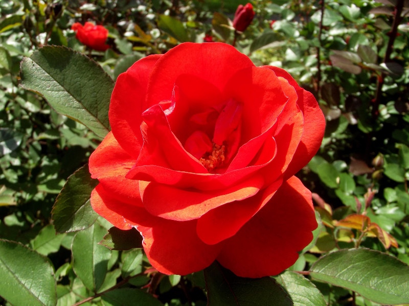 Роза канадская парковая Моден Файрглоу (Morden Fireglow) – это компактный кустарник, который радует обильным цветением и необычной окраской. Яркие оранжево-красные цветки, редкие для зимостойких роз, распускаются из заостренных бутонов в рыхлые ароматные цветки. Первое цветение особенно обильное. Махровые цветки чашевидной формы состоят из 28 лепестков с красной внутренней стороной и появляются в небольших кистях. Куст Моден Файрглоу низкий и ветвистый.