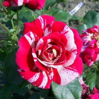 Саженец плетистой розы Твист (Twist) представляет собой многолетний декоративный кустарник с вертикально растущими побегами. Высота растения достигает 150-200 см, а диаметр цветка составляет 10-12 см. Цветки крупные, полумахровые, кувшинчатой формы, с яркой пестрой окраской: бело-розовые полоски и пятна на малиновом фоне. Обладают приятным легким ароматом и собраны в небольшие кисти по 3-5 штук.