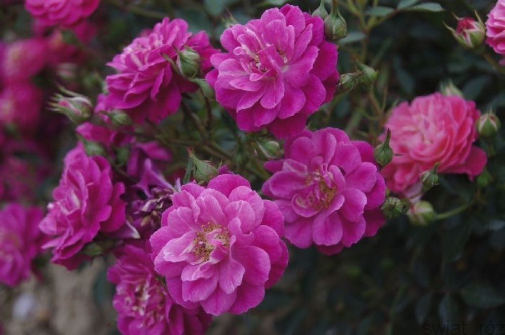 Эта роза, обильно цветущая и легкая в уходе, является отличным выбором для начинающих садоводов. Однако, она достаточно красива, чтобы завоевать расположение и опытных садоводов. Мелкие, округлые бутоны распускаются в полумахровые, 4-5 см, чашевидные или плоские цветки густо-розового цвета. Полностью раскрывшиеся лепестки показывают белый глазок в центре и пучок желтых тычинок. Цветки слабо пахнут, но появляются в больших кистях. Цветение продолжается волнами длительный период: с раннего лета и до морозов. Осенью куст украшают мелкие красные плоды. Куст низкий, раскидистый, обычно 60-80 см в высоту и 100-120 см в ширину. Прекрасно смотрится при посадке группами по 3 шт и более, создавая яркое пятно цвета. Посадите его в качестве ландшафтного акцента, как почвопокровную розу или живую изгородь. Поникающие побеги красиво смотрятся если позволить им свисать с невысокой подпорной стенки или в контейнере. Обычно считается устойчивым к болезням, но некоторые сообщают о заболеваниях мучнистой росой или черной пятнистостью, особенно в жарком, влажном климате.